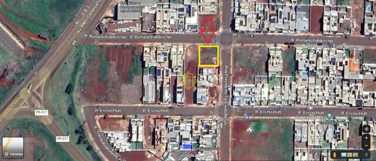 O terreno é de esquina, entre as Ruas Romano Feldkircher (medida: 18,20 m) e Rua Presidente Tancredo Neves (medida: 19,80m).